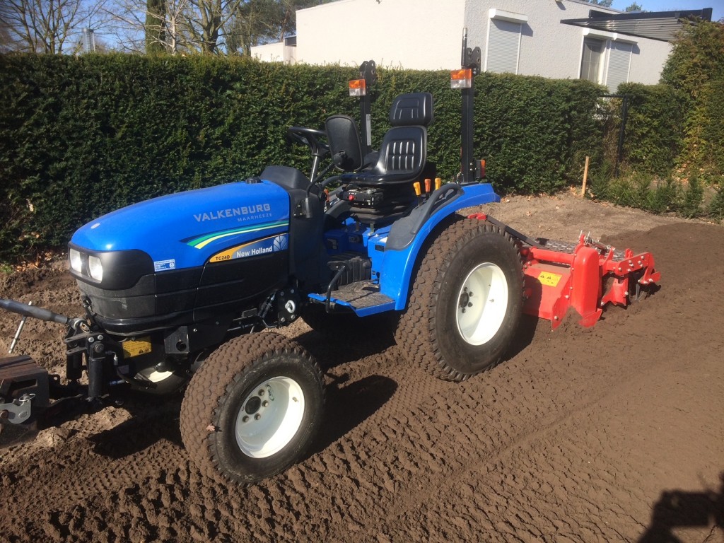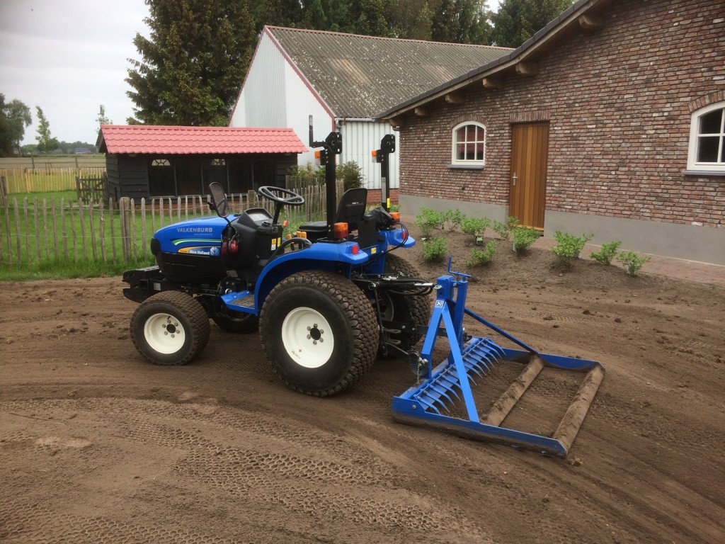 De overtopfrees gebruiken we om de zode te verkleinen en in de grond te verwerken. Deze machine zorgt er namelijk ook voor dat er altijd een kleine laagje zwarte grond bovenop ligt zodat er eventueel direct weer gras kan worden ingezaaid. We gebruiken de overtopfrees alleen als we zeker weten dat de structuur van de grond goed is en als we niet veel hoeven te egaliseren.